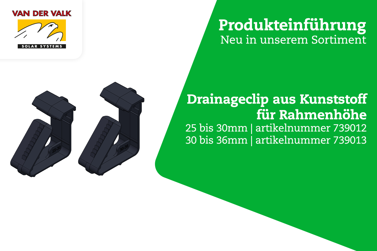 Neu in unserem Sortiment ist die drainageclip. Wir sind immer auf der Suche nach Möglichkeiten, das Beste aus der Solarenergie herauszuholen. Deshalb haben wir den drainageclip in unser Sortiment aufgenommen, eine clevere Lösung, die dafür sorgt, dass Wasser und Schmutz effektiv von den Rändern und Ecken des Solarmoduls entfernt werden.