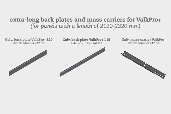 The dimensions of the latest generation of PV-panels brings new challenges for the mounting materials. Previously the ValkPro+ system was suitable to mount PV-panels up to a maximum length of 2120 mm for landscape orientation. With the addition of a new length for the back plate and mass carrier, it is now possible to install panels with a maximum length of 2320 mm.