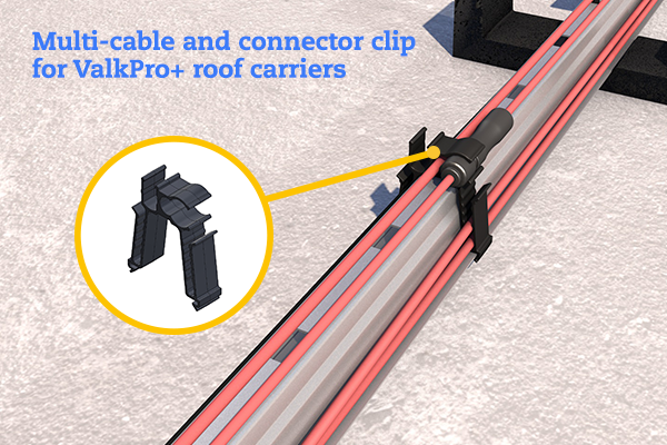 The plastic multi-cable and connector clip fits perfectly on the ValkPro+ roof carriers and can be applied in new and existing installations.