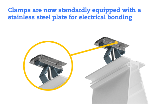 To offer a rapid and simple solution for electrical bonding of the substructure to the panel frame, we have fitted our panel clamps with an extra component: “stainless steel electrical bonding plate” on the underside of the clamp plate.