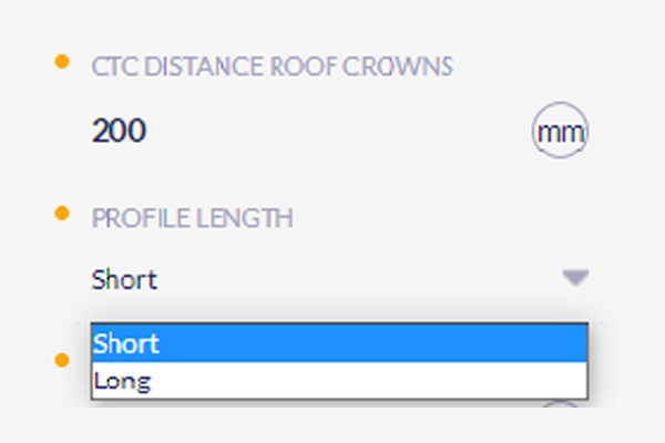 With the rationalization of the trapezoidal profiles we have also added an option where you can choose whether you want “long” or “short” profiles. These options only appear when the “CTC distance roof crowns” is 200, 300 or 400. When it is 100 the profile length only has the option for “long”. Here you can find the whole trapezoidal matrix.