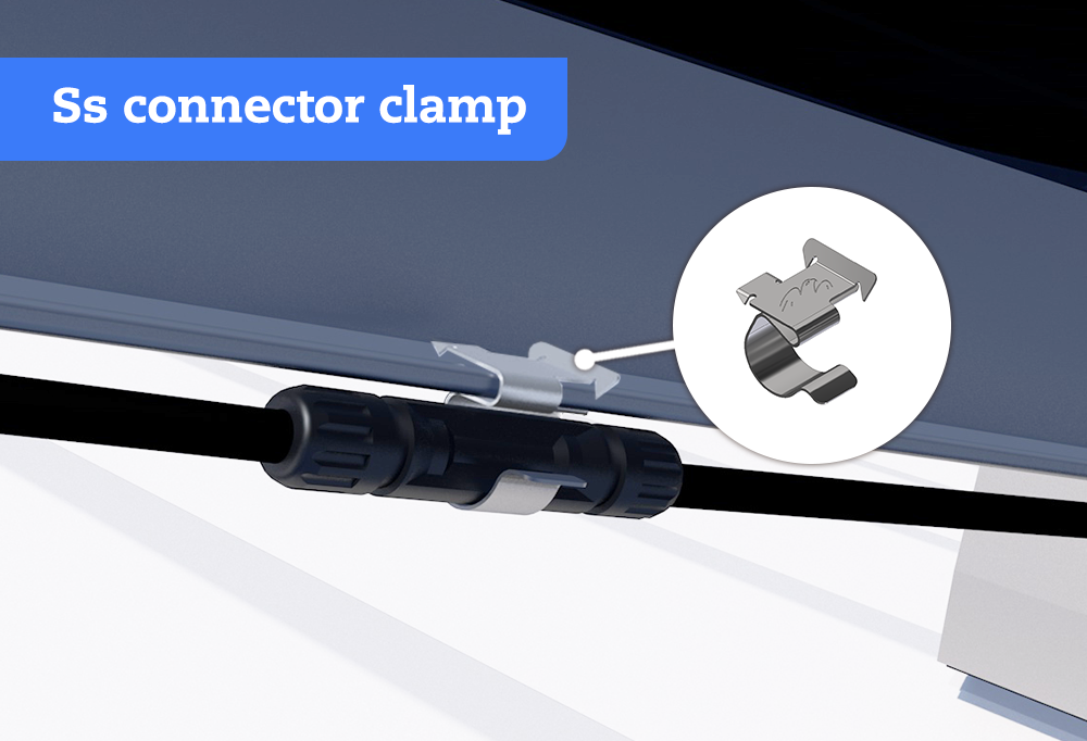 La fijación rápida y ordenada de los cables y conectores en los sistemas fotovoltaicos es de gran importancia para la seguridad del sistema y para evitar que se dañen los cables. La nueva abrazadera de conexión de acero inoxidable es única en su género, ya que, en comparación con las abrazaderas "Caddy" que se suelen utilizar a menudo, este nuevo diseño puede sujetarse tanto en paralelo como en sentido transversal al panel sin necesidad de un accesorio. De esta forma, siempre puede elegirse la posición más conveniente del conector.