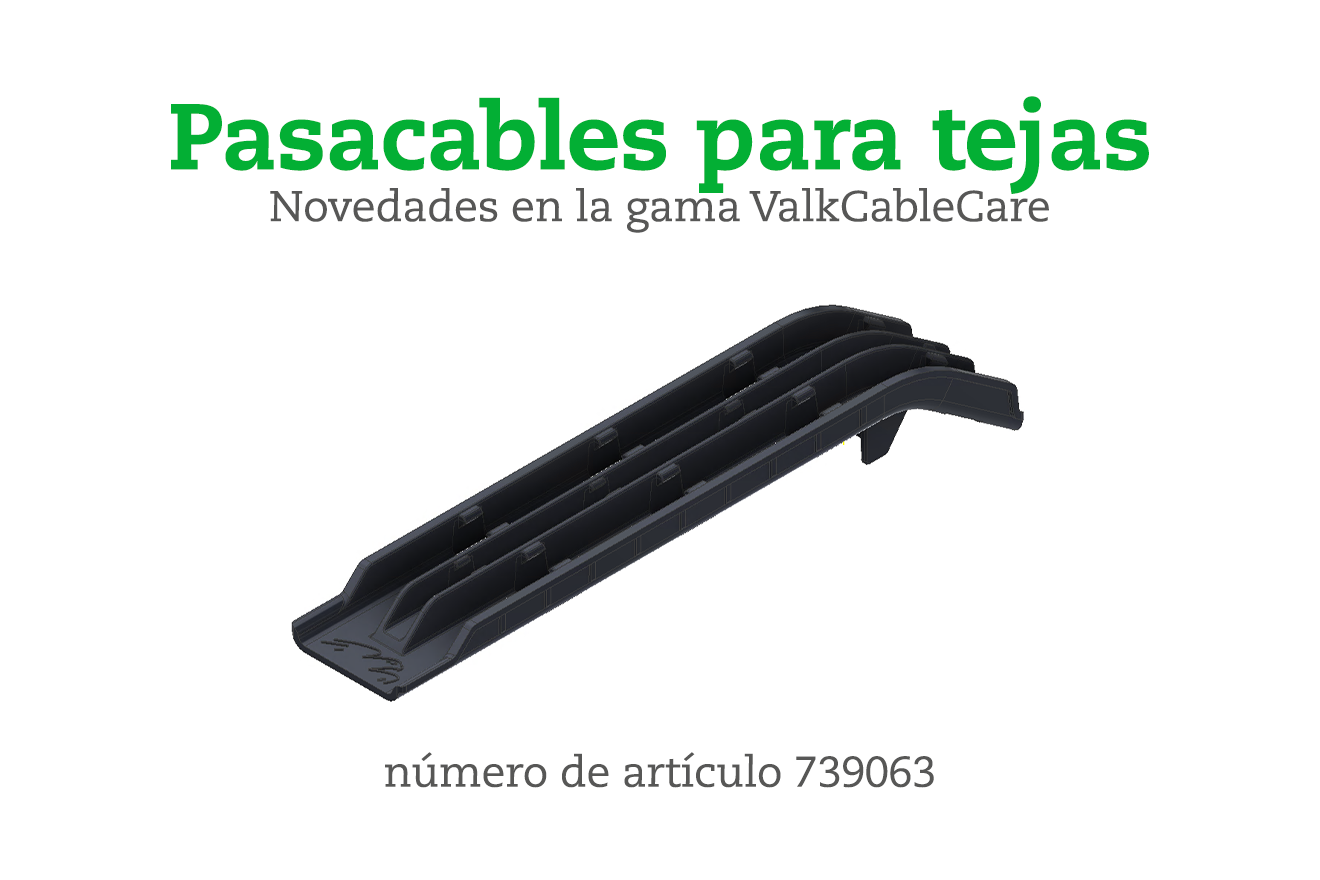 Nuevo en nuestra gama ValkCableCare: pasacables para tejas (número de artículo 739063). Especialmente diseñada para el paso seguro y profesional de cables en techos inclinados.