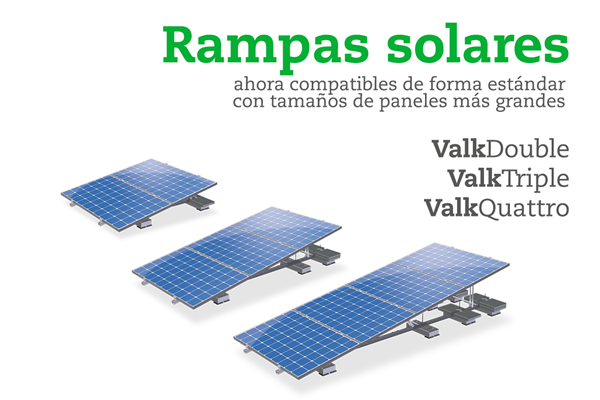 ¡Las rampas solares ValkDouble, ValkTriple y ValkQuattro han recibido una actualización! Diseñadas para colocar 2, 3 o 4 paneles solares uno debajo del otro en orientación horizontal, ahora son completamente compatibles con paneles solares de tamaños más grandes. Con esta actualización, ya no es necesario utilizar juegos de extensión al instalar formatos de paneles más grandes.