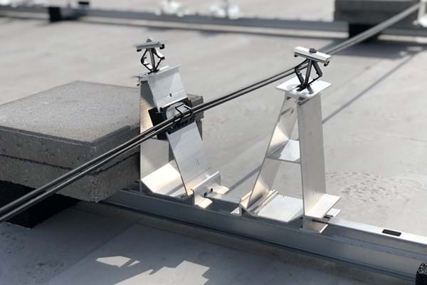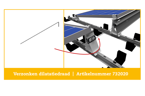 De 2e ontwikkeling voor de ValkPro+ is de verzonken dilatatiedraad. Aan dit draad kan de elektrische bedrading van het PV systeem vrij van het dakoppervlak opgehangen worden, in de posities waar een dilatatie in het ValkPro+ systeem voorzien is.