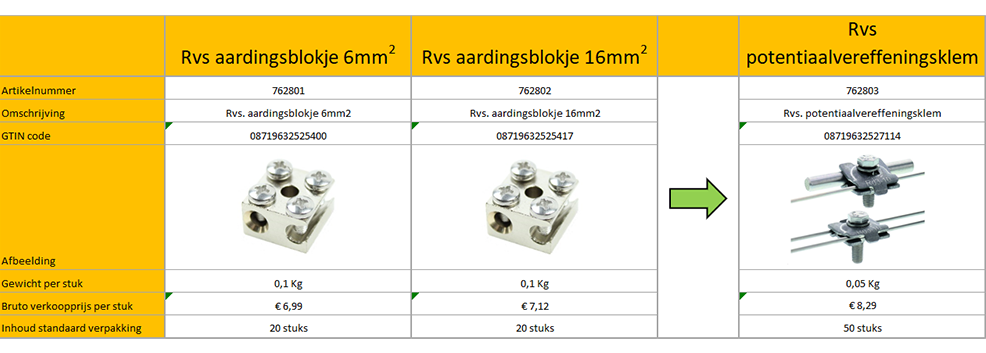 Tot op heden leverden wij hiervoor aardingsblokjes met speciale RVS schroefjes (762801 en 762802). Deze twee artikelen zullen worden vervangen door één multifunctionele potentiaalvereffeningsklem (762803) van het merk DEHN. De klem is uitgevoerd in RVS 316 materiaal voor optimale corrosiebestendigheid.