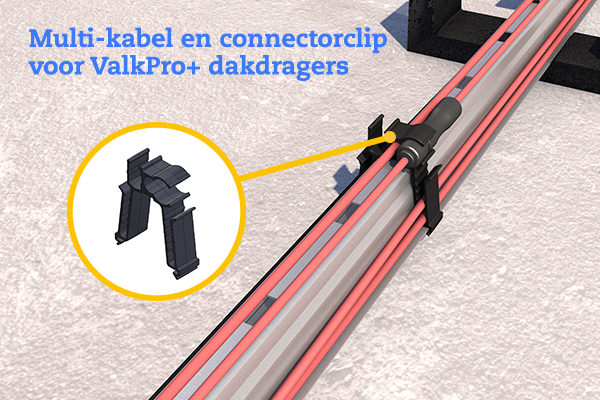 De kunststof multi-kabelclip past perfect over de dakdragers van het ValkPro+ systeem en kan zowel in nieuwe als bestaande installaties worden toegevoegd.