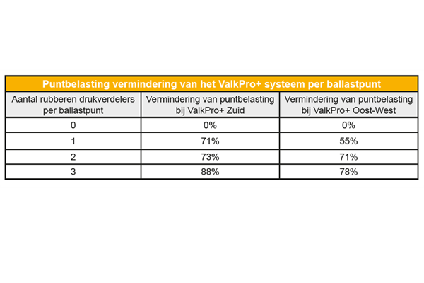 De drukverdelers kunnen eenvoudig onder de stalen dakdragers van bestaande en nieuwe ValkPro+ systemen worden geplaatst. Het toevoegen van één of meerdere drukverdelers per ballastpunt zal de puntlast van deze voet aanzienlijk reduceren. Zie tabel rechts: