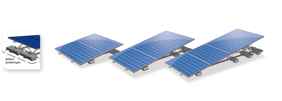 De betonnen massablokken en/of speciale betonnen fundatieblokken zorgen voor de benodigde ballast, bieden stabiliteit en verhogen het systeem wat het onderhoud vereenvoudigd. Ter voorkoming van onkruid wordt vaak een anti-worteldoek gebruikt.