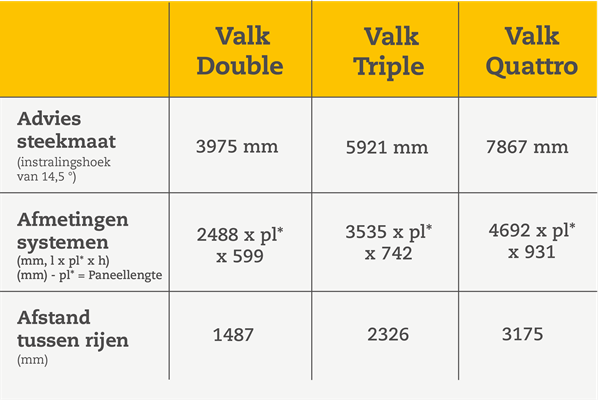 Bekijk hier welke steekmaat wij adviseren voor de afstand tussen de rijen voor een minimale schaduwwerking en optimaal rendement:
