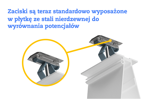Aby zapewnić szybkie i proste rozwiązanie do wyrównania potencjałów między podkonstrukcją a ramą panelu, wzbogaciliśmy nasze zaciski panelowe o dodatkowy element: „płytkę wyrównawczą ze stali nierdzewnej” na spodzie płyty zaciskowej.