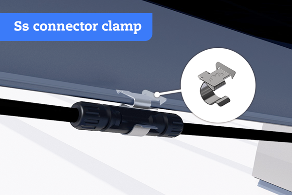 Att snabbt och enkelt kunna fästa solpanelernas kablar och kontakter är viktigt för systemets säkerhet och för att förhindra att kablarna skadas. Den nya, rostfria kopplingsklämman är unik i sitt slag. Jämfört med de ofta använda ”Caddy”-klämmorna, kan denna nya modell klämmas fast både parallellt och på tvären på panelen utan tillbehör. På så sätt kan den mest praktiska positionen för klämman alltid väljas.