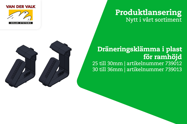 Nytt i vårt sortiment är dräneringsklämman. Vi letar alltid efter sätt att få ut så mycket som möjligt av solenergin. Därför har vi tagit in dräneringsklämman i vårt sortiment, en smart lösning som säkerställer att vatten och smuts effektivt avlägsnas från solpanelens kant och hörn.