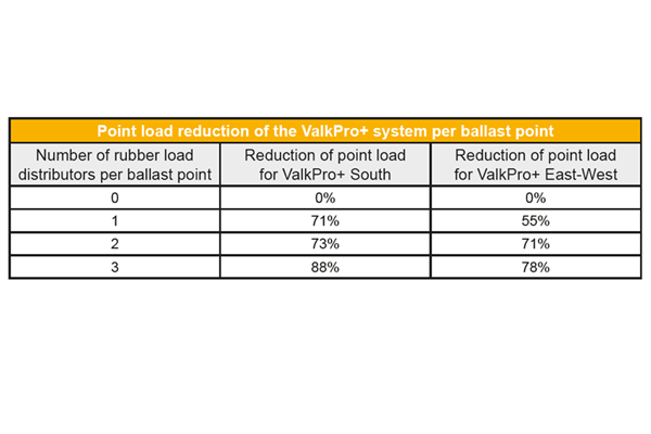 Tryckfördelarna kan enkelt placeras under takbärare av stål på befintliga och nya ValkPro+-system. Att tillsätta en eller flera tryckfördelare per ballastpunkt, kommer att minska punktlasten på denna fot. Se tabellen till höger: